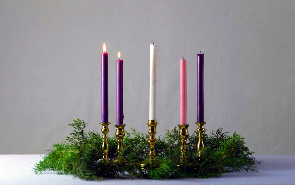 Many churches and some families have an Advent wreath. The four candles represent the four weeks of Advent. Each week signifies 1,000 years to represent the 4,000 years between Adam and Eve until the birth of Christ. Three of the candles are purple, and one is rose-colored. The purple candles symbolize the prayer, penance and preparatory good works undertaken at this time. The rose candle is lit on the third Sunday. This is the Sunday of rejoicing because the faithful have arrived at the mid-point of Advent. Many wreaths have a white candle in the center to be lit on Christmas Eve and Christmas Day to symbolize that the Savior, Jesus, has come.